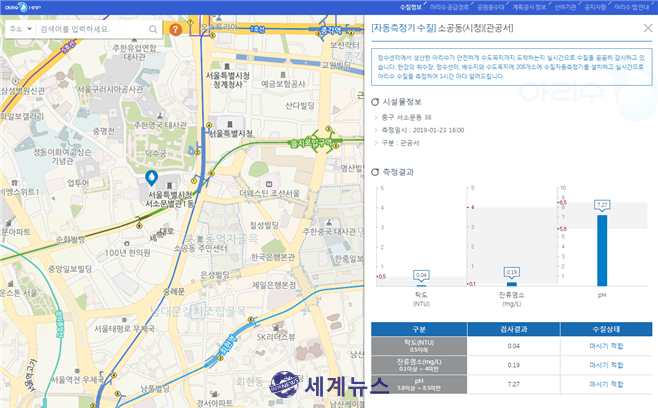 [세계뉴스] 차성민 기자 = 서울시(상수도사업본부)에서는 시민들이 보다 편리하게 수돗물 수질정보를 확인할 수 있도록 아리수 맵을 통해 제공한다고 밝혔다.