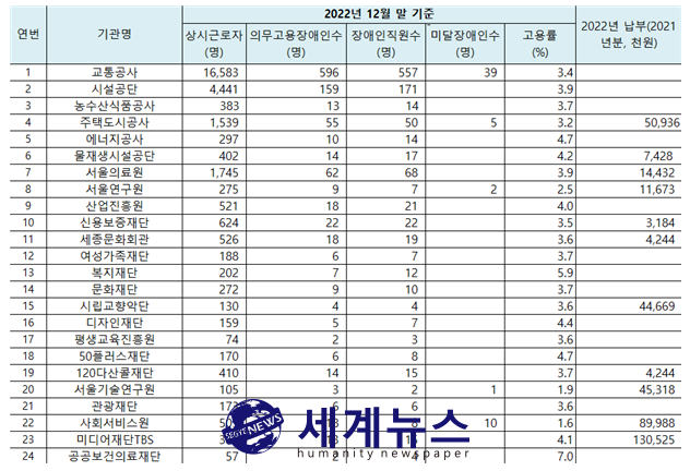 [세계뉴스 정서영 기자] 서울특별시 산하 상시근로자 50인 이상 공공기관 24곳 가운데, 6개 기관(2022.12말 기준)이 법에서 정하고 있는 장애인 고용 의무를 이행하지 않은 것으로 나타났다.