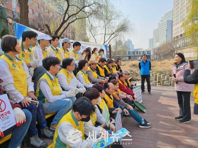 ▲ 지난 20일 박춘선 서울시의원이 세계 물의 날을 맞아 청계천에서 쓰레기 줍기 등 함께한 봉사단에게 행사 취지를 설명하고 있다. |
