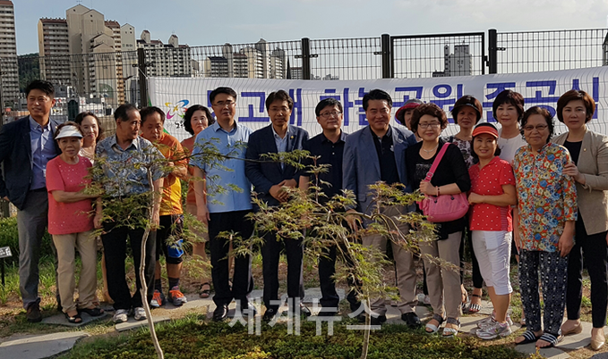 ▲ 서울시의회 국민의당 김광수 대표의원(가운데, 노원5)이 시 예산을 끌어와 4호선 당고개역사 상부에 주민 휴식공간을 조성해 22일 준공식을 가졌다. 서울시 최초로 전철구조물 상부에 공원을 조성했다. © 세계뉴스 |