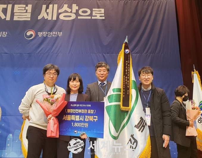 [세계뉴스 조홍식 기자] 강북구(구청장 이순희)가 지난 12일 행정안전부에서 개최한 2023년 주소정책 워크숍에서 ‘2022년 주소정책 업무추진 우수기관’으로 선정되어 행정안전부장관 표창과 특별교부세 1,800만원을 인센티브로 받았다.