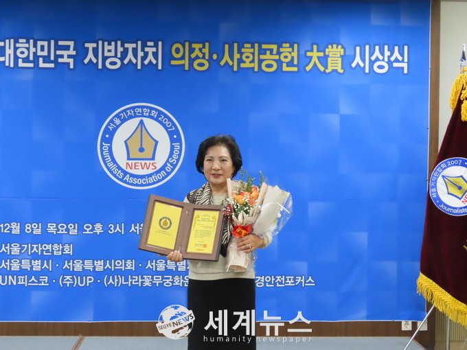 [세계뉴스 차성민 기자] 8일 (사)나라꽃무궁화운동중앙회 이경애 수석부회장이 서울기자연합회가 주관한 ‘제15회 2022 대한민국 지방자치 의정·사회공헌 大賞 시상식’에서 사회공헌 대상을 수상했다.