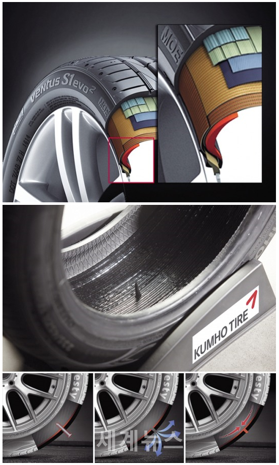 ▲ 한국타이어의 런플랫 타이어 구조도(위)와 금호타이어의 마제스티솔루스 실란트 타이어. (제공=한국·금호타이어) © 세계뉴스 |