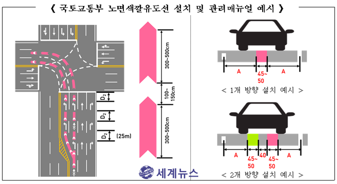 [세계뉴스] 조홍식 기자 = 주행방향이 여러 갈래이거나 혼동하기 쉬운 교차로와 도시고속도로 분기점에서 운전자가 가야할 방향을 분홍색 바닥선으로 알려주는 ‘주행유도선(노면색깔유도선)’, 서울시가 ‘주행유도선’이 그려진 교차로의 전‧후 교통안전을 비교한 결과, 사고위험도와 차로변경 건수 모두 절반 가까이 감소한 것으로 나타났다.