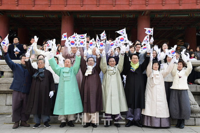 ▲ 1일 오전 서울 보신각에서 개최된 ‘제99주년 3·1절 기념식’ 타종행사에 참석한 박원순 서울시장과 양준욱 의장 등이 만세를 부르고 있다. © 세계뉴스 |