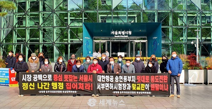 [세계뉴스 전승원 기자] 서울시 마포구 상암동 주민들은 24일 오전 10시 30분 서울시청 앞에서 기자회견을 열고 “서울시와 LH가 계획중인 종로구 송현동 대한항공 부지와 마포구 상암동 서부면허시험장의 맞교환 계획에 반대한다”는 성명을 발표했다.