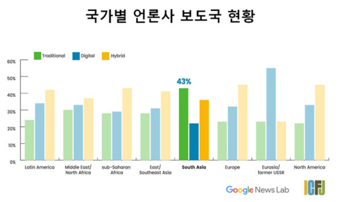 대부분 국가에서 TV, 라디오, 신문, 잡지 등 전통 미디어보다 디지털 온리(Digital-only) 및 하이브리드(디지털과 전통 미디어의 혼합)가 강세인 것으로 나타났지만, 남아시아에서만 전통 미디어가 디지털 미디어보다 강세를 유지하고 있는 것으로 조사됐다.