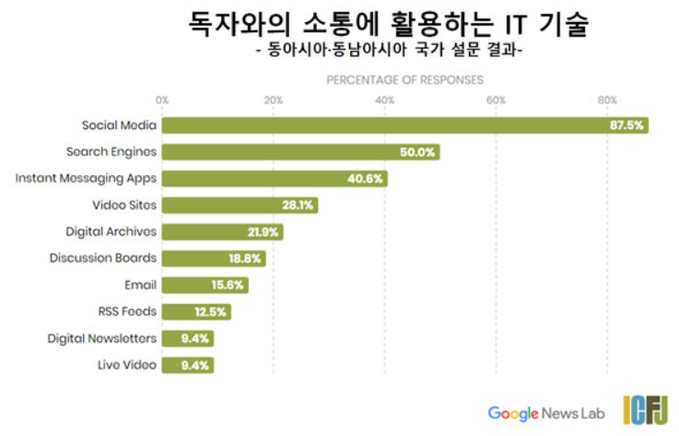뉴미디어 시대가 도래하면서 언론사들은 충성 독자를 확보하기 위해서는 독자와의 소통이 중요하다는 점에 모두 동의하고 있다. 독자와 소통을 위해 전 세계 기자들이 가장 많이 사용하는 기술은 소셜미디어, 이메일, 검색엔진이었다.