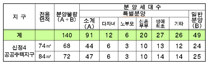 신정4지구 분양주택은 서울특별시 1년이상 거주자에게 우선 공급하며, 미달시 수도권(서울특별시 1년미만 거주자 및 인천광역시, 경기도 거주자)거주자에게 공급한다. 다만 다자녀 특별분양의 경우는 서울시 거주자에게 50%, 수도권 거주자에게 나머지 50%를 공급한다.