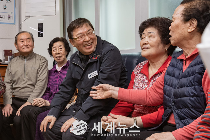 | ▲ 김경호 광진구청장이 취약계층 어르신들과 얘기를 나누며 웃고 있는 모습. |