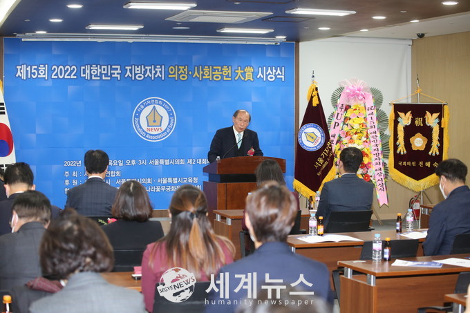 [세계뉴스 차성민 기자] 서울기자연합회(회장 정상린)는 8일 오후 3시 서울특별시의회 대회의실에서 ‘제15회 2022 대한민국 지방자치 의정·사회공헌 大賞’ 시상식을 개최했다.