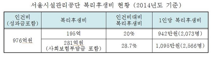 서울시설관리공단은 복리후생비가 인건비의 약 20% 수준으로 직원 1인당 복리후생비가 약 940만원에 이르러 사회통념보다도 과다한 복리후생 규정을 적용했다.