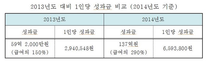 또한 원가 절감· 경영 혁신 등 경영 성과 개선이 아닌 단순히 정부 시책을 준수했다는 이유로 약 137억원에 달하는 성과금(1인당 660만원)을 지급했다.