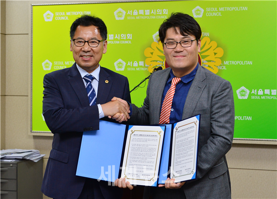 ▲ 서울시의회 더불어민주당 김종욱(오른쪽) 원내대표의원과 새누리당 강감찬(왼쪽) 원내대표의원이 서울시의회 제9대 후반기 원구성 합의후 악수하고 있다. © 세계뉴스 |