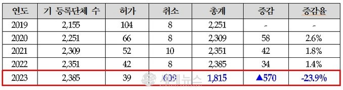 2023년 등록허가 건수는 지난 5년간 가장 적은 39건에 불과했으며, 등록취소 건수는 전년 8건에 비해 76배 증가한 609건으로 올해에만 570개의 비영리민간단체가 사라진 것으로 나타났다.