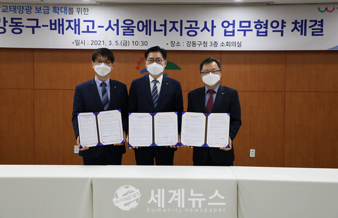 공사는 이와 관련 5일 강동구청에서 강동구청(구청장 이정훈), 배재고등학교(교장 고진영)와 함께 학교부지를 활용한 태양광발전사업 업무협약을 체결했다.