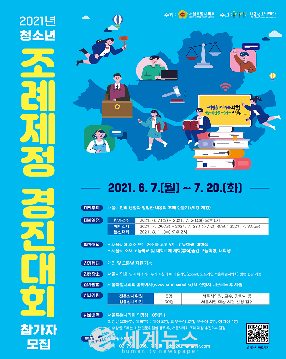[세계뉴스 윤소라 기자] 서울시의회(의장 김인호)는 지방자치 부활 30주년 기념행사의 일환으로 한국청소년재단과 함께 ‘2021 청소년 조례제정 경진대회’를 개최한다.