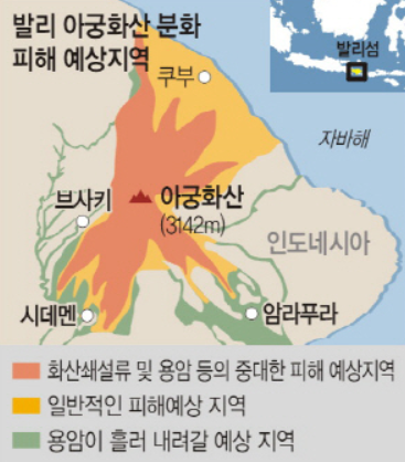 발리 최고봉 아궁화산은 해발 3142m로 1808년부터 1963년까지 수차례 분화하고 54년 만에 6번째이다. 특히 1963년 대분화 때 약 1500명의 사망자가 나왔다.