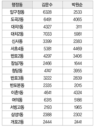 중앙선거관리위원회 개표 결과를 보면, 서울 강남구에서 김 후보의 선전이 두드러졌다. 김 후보가 박 시장을 크게 압도한 곳은 압구정동이다. 김 후보는 6328표를 얻어 2533표를 기록한 박 시장을 더블 스코어 이상으로 눌렀다. 도곡2동에서도 김 후보(6491표)와 박 시장(4065표)은 2천표 이상 차이가 났다. 대치1동(김문수 4327, 박원순 3111), 대치2동(김 7033, 박 5981), 신사동(김 3399, 박 2383), 청담동(김 4747, 박 3955)에서도 표 차이가 제법 났다. 삼성1동(김 2388, 박 2302)에서는 86표 차이였고 개포2동에서는 김 후보(2444표)가 박 시장(2441표)보다 3표가 많았다. 서초구에선 서초4동(김 5381표, 박 4469)과 반포2동(김 4297, 박 3406), 반포3동(김 3222, 박 2839), 반포본동(김 2335, 박 2015)에서 김 후보가 이겼다. 송파구에서 김 후보가 1위를 차지한 곳은 잠실7동(김 2466, 박 1644)이 유일했다. 전통적인 자유한국당 지지세에다 초과이익 환수제 도입으로 뜨거워진 재건축 이슈가 표심을 좌우한 것으로 분석된다.