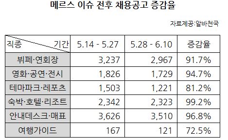알바천국이 집계한 메르스 이슈 이후인 지난달 28일부터 이달 10일까지의 ‘영화·공연·전시’, ‘테마파크·레포츠’, ‘여행가이드’, ‘뷔페·연회장’, ‘안내데스크·매표’, '숙박·호텔·리조트 등 총 6개 서비스업종의 채용공고 수는 그 전 2주(5월 14일~5월 27일) 대비 10.7%의 큰 감소세를 보이는 것으로 집계됐다.