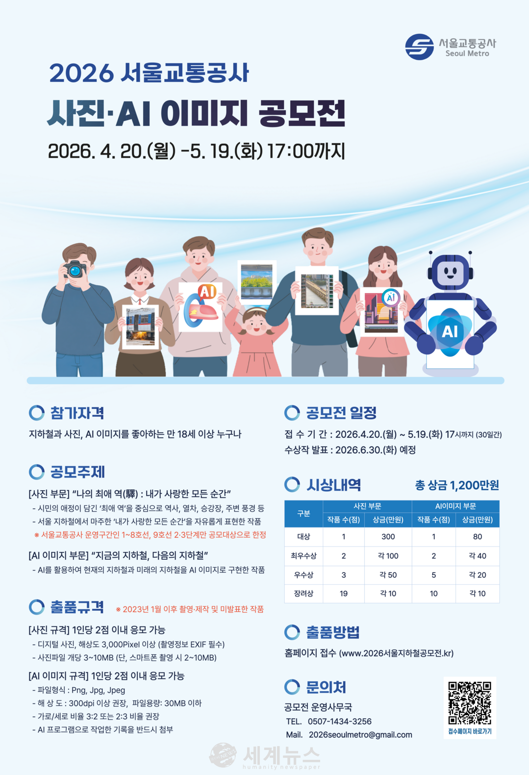 [세계뉴스 = 차성민 기자] 서울교통공사가 시민이 일상 속 지하철 풍경과 미래 도시철도의 모습을 함께 그려보는 ‘2026 서울교통공사 사진·AI 이미지 공모전’을 4월 20일부터 5월 19일까지 연다.