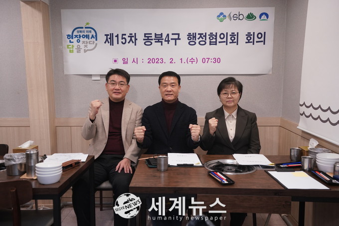 ▲ (왼쪽부터) 오승록 노원구청장, 이승로 성북구청장, 이순희 강북구청장이 1일 오전 제15차 동북4구 행정협의회를 갖고 기념촬영을 하고 있다. |