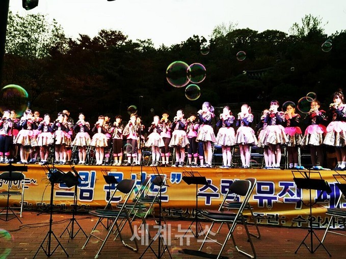 ▲ 23일 노원구 상계동 수락산 당고개 공원에서 서울시 공원 문화사업으로 '2015 수락산 문화나눔 콘서트'가 개최됐다. 이날 신상계초등학교 3학년부터 6학년으로 구성된 63명의 '드림오케스트라'는 ABBA곡,Beatles곡, 캐리비안의 해적 OST, 가요모음곡 등을 연주해 갈채를 받았다. © 세계뉴스 |