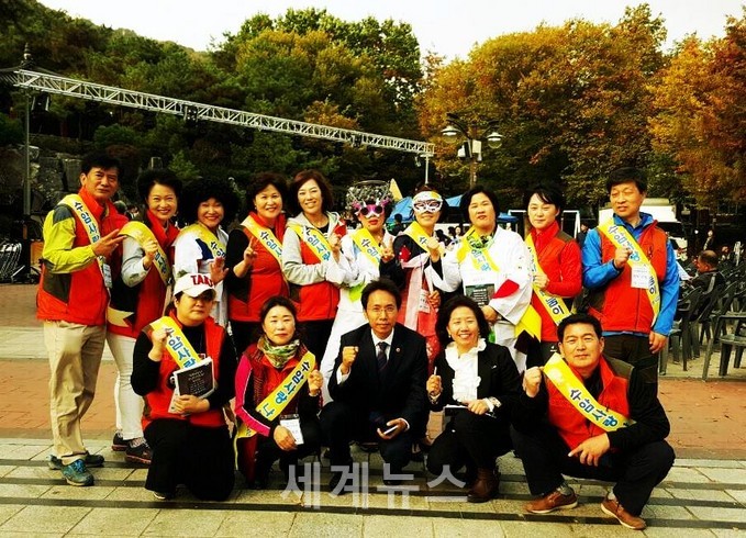 ▲ 23일 '2015 수락산 문화나눔 콘서트'에 참여한 노원지역의 '수암사랑나눔봉사단' 회원들이 김광수 서울시의원(앞줄 가운데)과 기념촬영을 하고 있다. © 세계뉴스 |