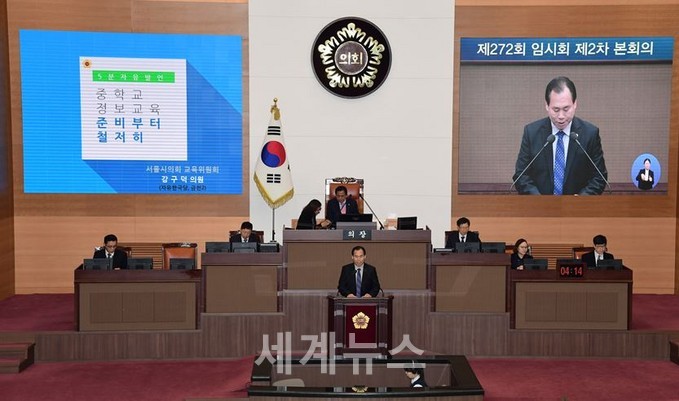 ▲ 제272회 임시회 제2차 본회의에서 강구덕 의원이 5분 자유발언을 통해 “현재 서울시 관내 컴퓨터실이 없는 32개 중학교의 컴퓨터실 구축과 노후화된 컴퓨터 교체 등을 주문하며 2019년 ‘정보’교과 첫 수업에 차질이 없도록 철저히 해달라"고 당부했다. © 세계뉴스 |