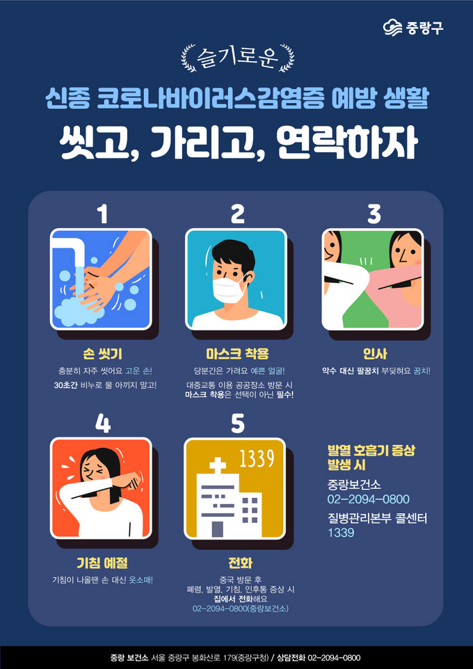 [조홍식 기자] 서울시 중랑구(구청장 류경기)가 ‘신종 코로나바이러스’ 대응을 위해 적극 나섰다. 구는 ‘씻고’, ‘가리고’, ‘연락하기’를 키워드로 쉽게 실천할 수 있는 감염 예방 수칙 전파에 주력하고 있다고 밝혔다.