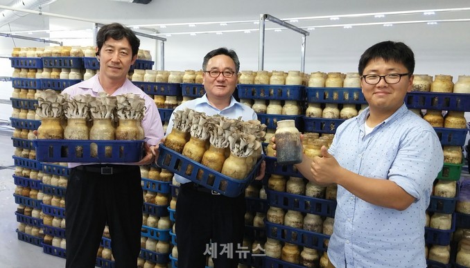 ▲ 21일 SH공사 주거복지본부 시설관리처 정갑수 처장(가운데)과 윤형국 팀장(왼쪽), 서인호씨가 첫 수확된 느타리버섯을 들어 보이며 환하게 웃고 있다. © 세계뉴스 |