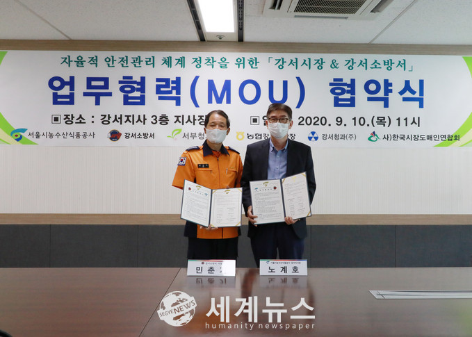 [세계뉴스 조홍식 기자] 서울시농수산식품공사(사장 김경호, 이하 공사)는 강서시장 화재 및 안전사고 등 재난 발생 시 신속한 대응으로 유통인의 생명과 재산을 보호하기 위하여 강서시장과 강서소방서간 안전관리 체계 정착을 위한 업무협약(MOU)을 10일 공사 강서지사에서 체결했다.