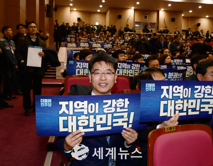 ▲ 2019 더불어민주당 참좋은지방정부위원회 발대식. 김용석 대표의원이 '지역이 강한 대한민국!' 피켓을 들고 있다. |
