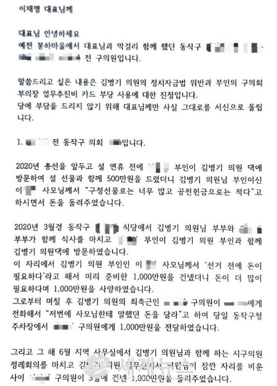 한겨레의 보도에 따르면, 동작구 전 구의원 ㄱ씨와 ㄴ씨는 2020년 초 각각 1천만 원과 2천만 원을 김병기 의원 측에 건넸으나, 3~5개월 뒤 이를 돌려받았다고 주장했다. 이 탄원서는 2023년 12월, 당시 민주당 총선 예비후보자검증위원장 겸 공천관리위원회 간사였던 김 의원의 문제를 당 지도부에 알리기 위해 작성됐다.