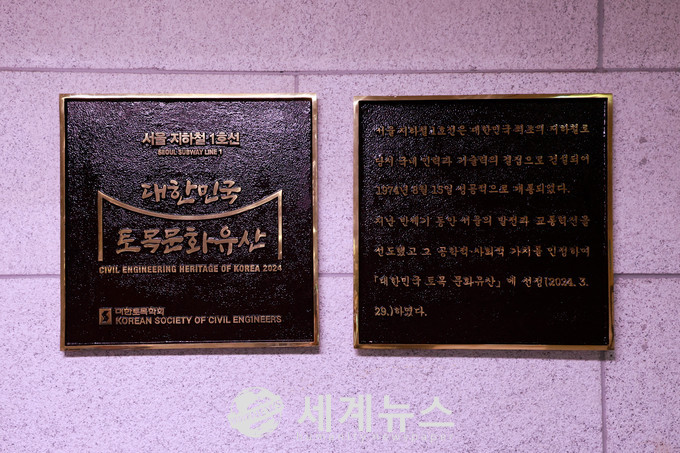 [세계뉴스 차성민 기자] 서울교통공사(사장 백호)는 1호선 시청역에 토목문화유산 지정 기념동판을 설치하고, 지난 12일 기념동판 제막식을 열었다고 밝혔다.