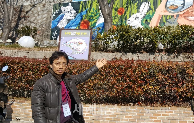 ▲ 김광수 서울시의원이 '동피랑벽화마을' 벽화를 가르키며 현장을 안내하고 있는모습. © 세계뉴스 |