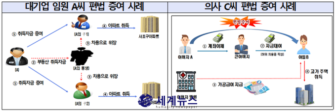 특히 지난 2018년에는 대기업 임원 A씨가 자신의 두 아들에게 증여할 주택 매입자금을 자신의 동생인 B씨에게 전달하고, 이후 B씨가 자신의 두 아들에게 돈을 빌려주도록 해서 자신의 두 아들이 서울시 서초구 소재 아파트를 각각 구입할 수 있도록 도운 사실을 밝혀냈다.