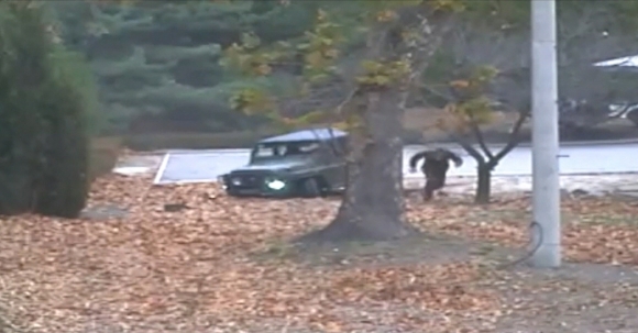 ▲ 지난 13일 판문점 공동경비구역(JSA)에서 북한 병사가 지프 차량에서 내려 남쪽으로 달리고 있다. 유엔군 사령부가 22일 공개한 당시 CCTV장면. (유엔군사령부 제공) © 세계뉴스 |