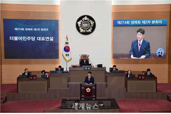 ▲ 서울시의회 더불어민주당 김동욱 대표의원이 13일 제274회 정례회 제2차 본회의에서 대표연설을 하고있다. © 세계뉴스 |