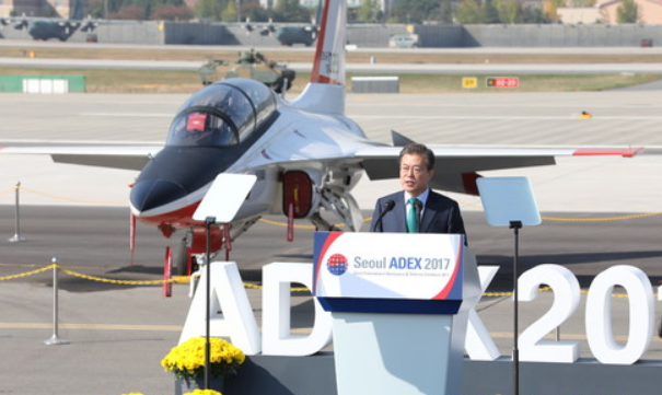 문 대통령은 "불과 반세기 전 우리는 소총 한 자루도 제대로 만들 수 없어 군사원조에 의존했지만 이제 초음속항공기를 직접 만들어 수출까지 하는 나라로 우뚝 섰다"며 "T-50 고등훈련기는 지난 10년간 23억 달러 이상 해외 판매됐고, 성능·가격 면에서 세계 최고 수준으로 평가받고 있다. 차세대 다연장로켓 '천무'도 세계 시장에서 새롭게 주목받고 있다"고 평가했다.