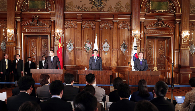 우리 대한민국, 일본국, 중화인민공화국 지도자들은 제7차 3국 정상회의를 계기로 2018년 5월 9일 일본 도쿄에서 회동하였다.