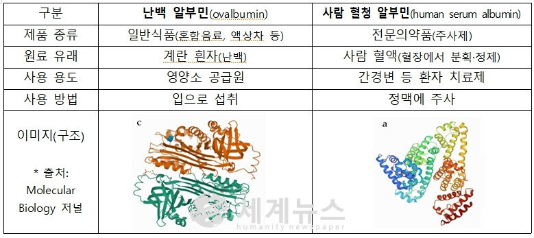 식약처는 특히 식품 원료로 쓰이는 난백(달걀 흰자) 알부민과 의료 현장에서 사용하는 혈청 알부민을 동일하게 인식하는 소비자 혼선을 우려했다. 혈청 알부민은 혈액 내에서 고유한 생리 기능을 수행하는 단백질로, 의사의 처방에 따라 간경변 환자 등에게 주사하는 전문의약품이다. 반면 난백 알부민은 달걀 흰자에서 유래한 식품 단백질로, 섭취 시 단순한 영양소 공급원에 불과해 의약품 성분인 혈청 알부민이 함유된 것으로 오인하지 말아야 한다고 강조했다.