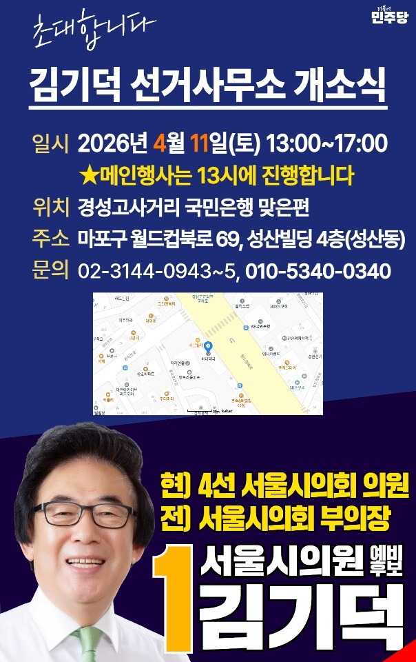 [세계뉴스 = 윤소라 기자] 더불어민주당 서울시의원 마포구 제4선거구(성산1·2동·상암동·망원2동·연남동) 후보로 현역 4선인 김기덕 서울시의원이 최종 확정됐다.