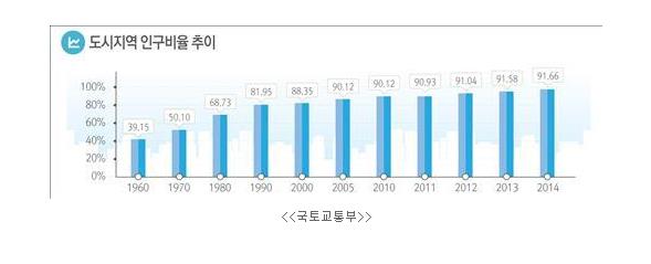 작년 도시지역에 사는 사람은 4천705만여명으로 전체 인구(약 5천132만명)의 91.66%였다.