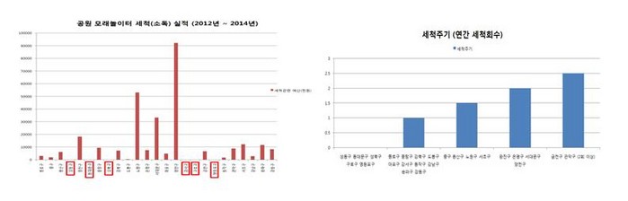이 역시도 성동구를 비롯한 6개 구는 모래 세척 예산이 전무하고 종로구를 비롯한 10개 구 역시 연간 세척회수가 1회에 불과해 위생 상태를 보장할 수 없는 상황이다.