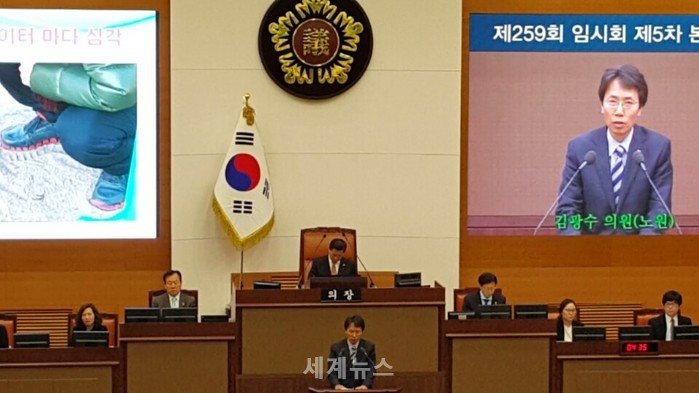▲ 김광수 서울시의원이 23일 제259회 임시회 마지막 날 본 회의장에서 5분 발언을 통해 "고양이 똥 모래놀이터 세균 온실"이라는 제목으로 어린이놀이터의 심각성을 지적하고 있다. © 세계뉴스 |
