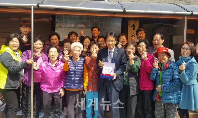 ▲ 서울시의회 환경수자원위원회 소속 김광수(가운데) 의원(국민의당, 노원5)은 22일 노원구 상계동 수락산 자락에 위치한 '숲속경로당'에서 어르신들로부터 감사패를 전달 받았다. © 세계뉴스 |