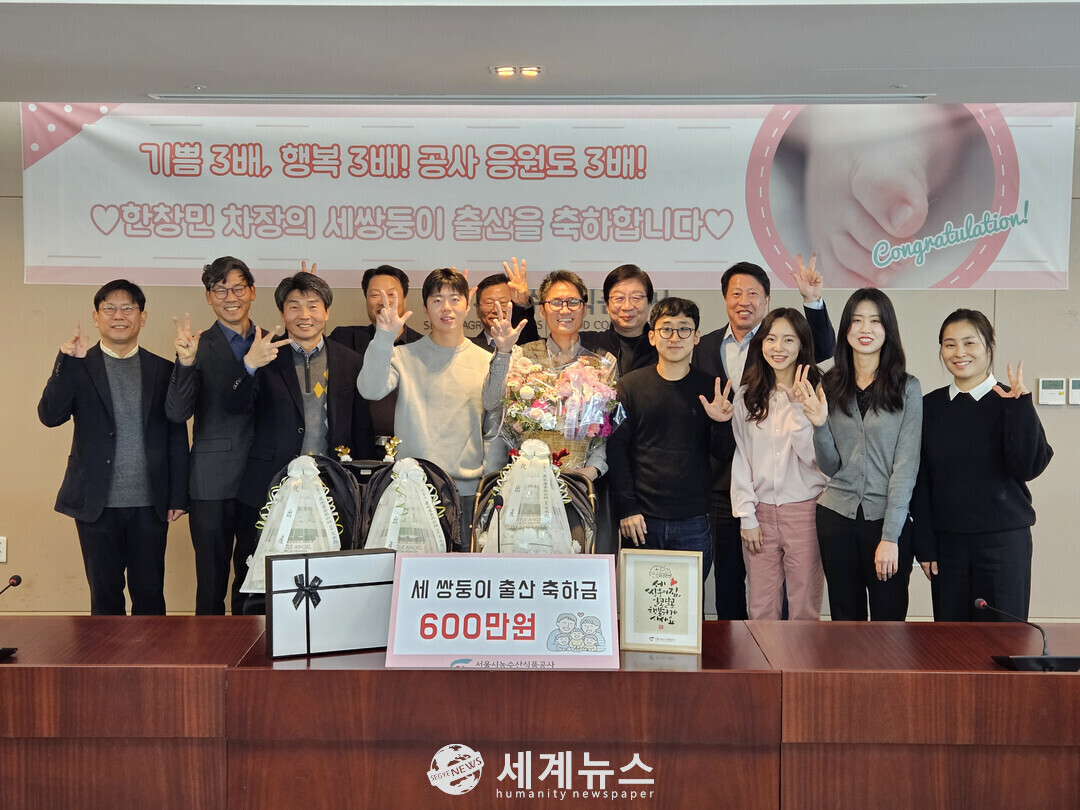 [세계뉴스 = 조홍식 기자] 서울시농수산식품공사(사장 문영표)가 사상 처음으로 세쌍둥이를 출산한 직원을 축하하기 위해 특별 행사를 개최했다.