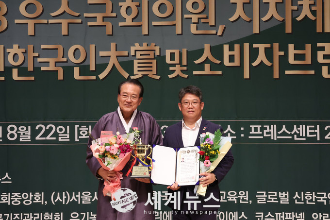 ▲ 서상열(오른쪽) 서울시의원이 22일 시사대한뉴스 주최, 대한노인중앙회와 서울시민회 등이 주관하는 ‘2023 지자체 의정대상’에서 의정발전 및 지역사회공헌 부문 의정대상을 수상했다. |