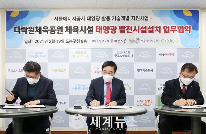▲ 23일 김중식(오른쪽) 서울에너지공사 사장과 이동진(가운데) 도봉구청장, ㈜그리드위즈 김구환(왼쪽) 대표와 '다락원체육공원 태양광설치'의 업무협약을 체결하고 있다. |